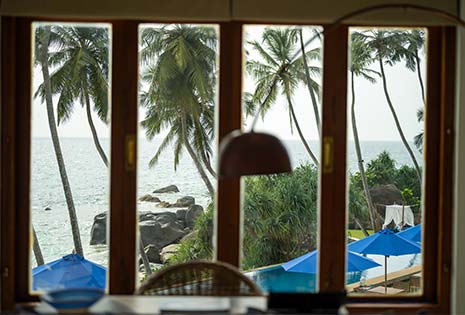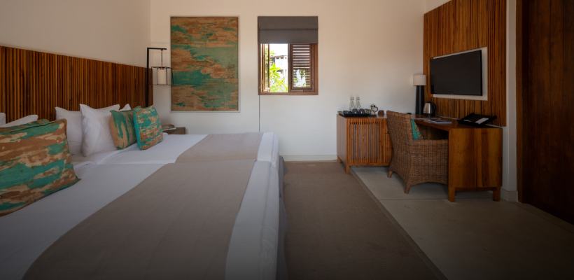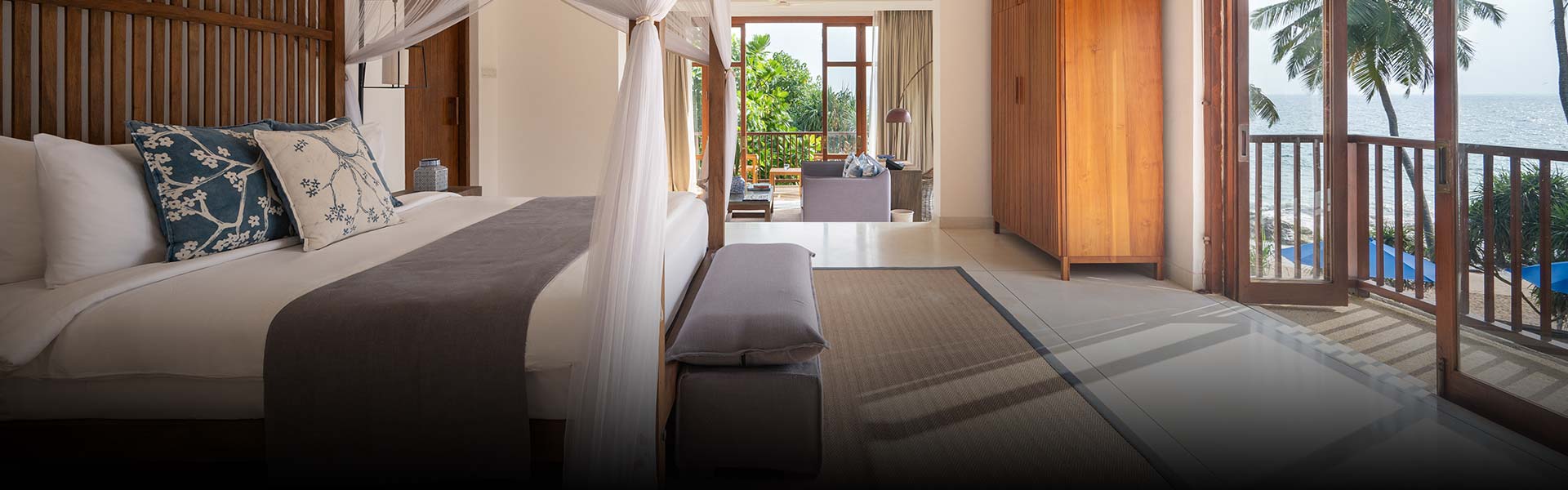 Bedrooms are furnished with king-size beds, private verandas or balconies overlooking the ocean, and bathrooms with pebble-floor showers.