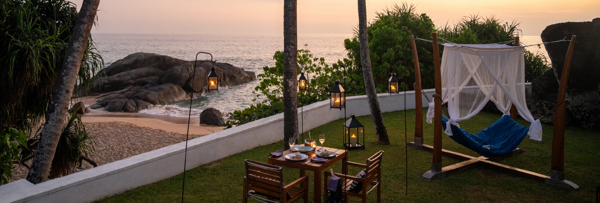 Just steps from the waves, your table is set in an intimate corner of our beachfront lawn, softly illuminated by flickering lanterns and candlelight. Enjoy a specially curated five-course dinner with flavours inspired by the island’s coastal bounty, and a complimentary glass of red or white wine. This experience is available on request with prior notice and is weather dependent.