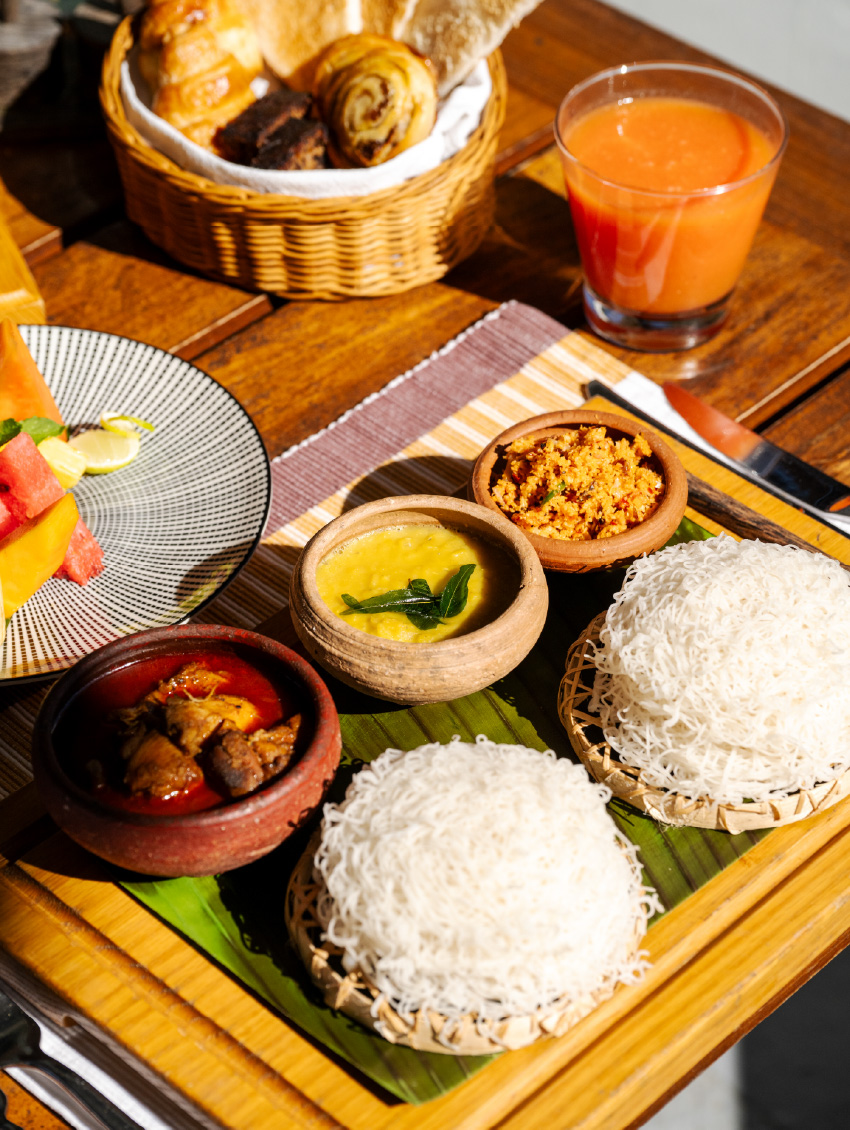 Hoppers are made using a base of rice flour and coconut milk and cooked in a unique way that forms a natural basket-shaped crepe of sorts, with a crisp outer shell and a soft, fluffy interior pillow, which can sometimes feature a poached egg. String hoppers are delicate nests of steamed rice noodles – both these dishes are gluten free when made with rice flour and traditionally accompanied with a range of sambols, lunu miris and curries.