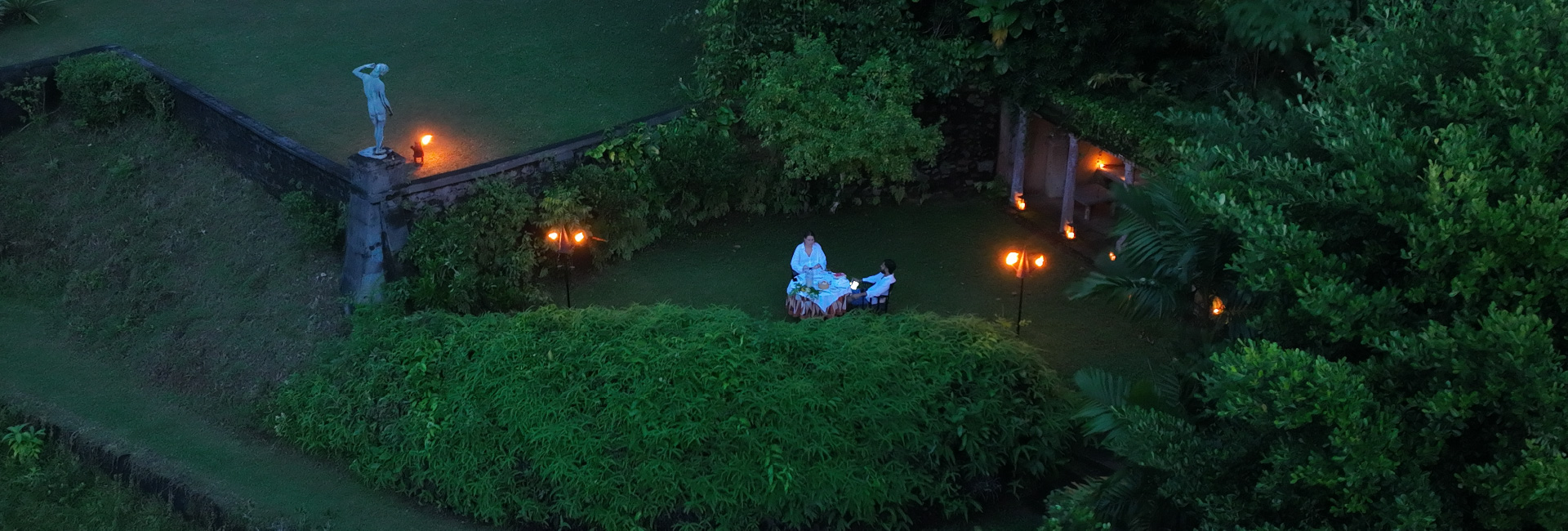 At Lunuganga, our private dining experiences unfold in unique settings. Depending on availability, you can choose from the striking Red Terrace, the breezy Sandela, or the timeless Roman Pavilion. A candlelit dinner in the garden is the most evocative of these experiences. Lanterns glow against water and foliage, as you sit down to a five-course menu inspired by Sri Lanka’s seasonal bounty, paired with a complimentary glass of wine.